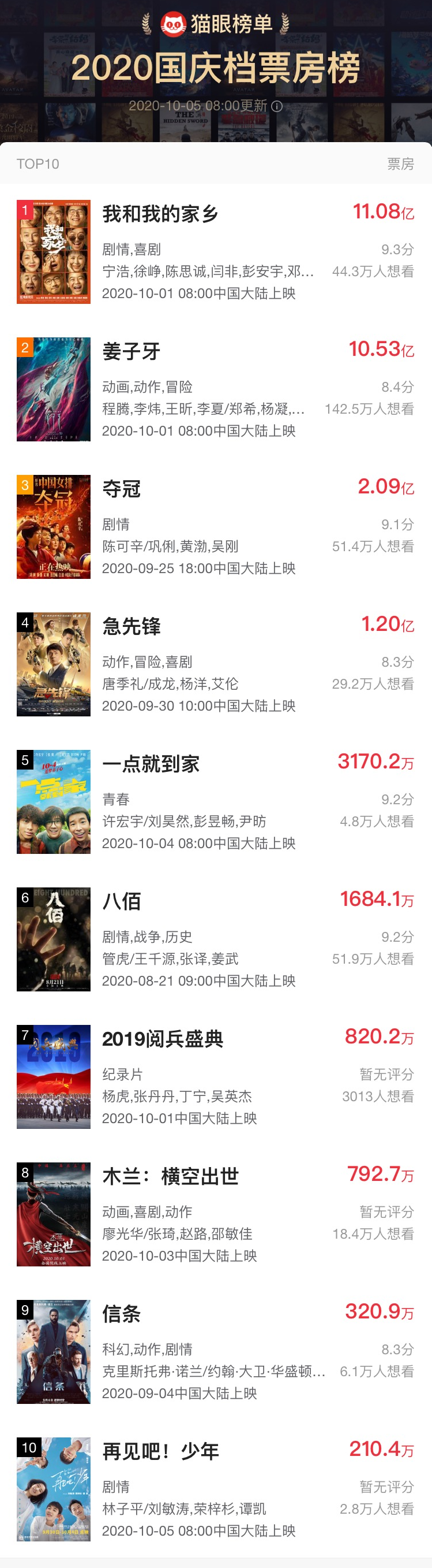 “十一”黄金周第四天,2020年国庆档的两部热门影片《我和我的家乡》《姜子牙》的票房均突破了10亿大关,点燃市场热情。截至10月5日06:50,《我和我的家乡》累计票房已突破突破11亿元。