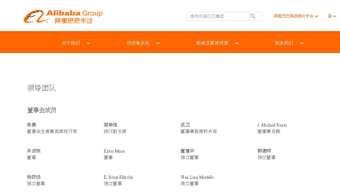 阿里巴巴9月30日在港交所发布公告称,于公告日期当日,阿里巴巴的董事会包括董事张勇(董事会主席)、蔡崇信、武卫、J. Michael Evans、井贤栋及Kabir Misra;以及独立董事董建华、郭德明、杨致远、E. Brje Ekholm及Wan Ling Martello。