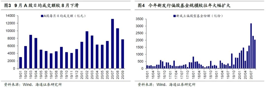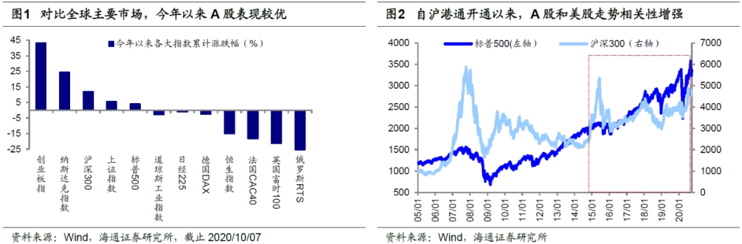 短期外盘隐忧消除。9月市场交投清淡,A股日均成交额仅为7680亿元,较8月下降了27%,市场成交额萎缩,背后的原因在于投资者担忧十一长假期间海外市场不确定性或将对A股造成冲击,类似2018年10月的情形再现A股。长假期间确实发生了一些事情,美国总统特朗普于当地时间10月2日发布推特称其新冠检测为阳性,此后特朗普入院治疗,10月5日特朗普已返回白宫,10月6日特朗普发推特称已叫停与民主党的刺激方案谈判。但股市整体有惊无险,10月以来标普500累计涨幅为1.7%,道琼斯工业指数为1.9%,纳斯达克指数为1.8%,日本225指数为1.0%,德国DAX为1.1%,恒生指数为3.3%。回顾05年以来,A股与美股走势早期较为独立,但是自从14年11月沪股通开通后,外资进出A股渠道更加顺畅,A股与美股联动越来越明显。跟踪自05年以来沪深300和标普500两大指数收盘价相关性,在05/01-14/11期间两者相关系数为0.06,而在14/11至今相关系数提高至0.45。但是,这并不意味着当前美股高位波折必将拖累A股,这是因为无论从基本面还是估值角度看,目前A股都比美股表现更好。从基本面看,疫情对我国经济冲击有限,根据世界银行数据,2020年中国GDP预测增速从疫情前的5.9%调低至疫情后的2.0%,而美国GDP预测增速从疫情前的1.8%调低至疫情后的-6.1%。从估值角度看,目前沪深300PB为1.57倍,处于05年以来估值从低到高的37%分位数,而标普500为3.68倍、98%分位数。无论从相对估值还是绝对估值看,A股都比美股便宜。综上,A股比美股估值更低而且业绩更好,所以A股今年以来表现优异,统计今年以来全球主要市场股指表现,具体如下:创业板指累计涨幅为43.2%,纳斯达克指数为26.3%,沪深300为12.0%,上证指数为5.5%,标普500为5.5%,道琼斯工业指数为-1.4%,日经225为-1.5%,德国DAX为-3.2%,恒生指数为-15.7%,法国CAC40为-18.5%,英国富时100为-21.2%,A股无疑是今年全球最靓的市场。