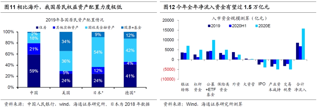 宏观流动性背景较好,微观流动性充裕。决定A股中期趋势是内因,根据经典的DDM模型,决定股价的因素主要包括流动性、基本面、风险偏好,A股流动性宽松和基本面向好将共同驱动市场走强。流动性可以分为宏观流动性和微观流动性,我们认为宏观流动性力度变小了,但是方向未变,微观流动性依旧充裕。宏观流动性是背景,可以从价、量两个角度衡量,价的指标包括:十年期国债收益率、R007利率、加权平均贷款利率、LPR利率、银行理财利率、非证券投资类信托产品利率,量的指标包括:社融存量增速、M2增速、贷款余额增速。从价的角度来看,年初以来利率整体下行,5月份后十年期国债收益率和R007利率有所回升,有投资者担忧货币政策边际收紧,如果再观察其他4个利率指标,我们会发现整体仍是在低位。从量的角度来看,年初以来社融存量增速、M2增速和贷款余额增速逐月稳步上升,7-8月份M2增速和贷款余额增速有所下降,但整体仍处于高位。综合宏观流动性的量、价指标来看,整体偏松格局没变。从历史经验上看,通胀上升导致货币政策转向收紧,一般CPI或PPI达到3%以上可能会触发货币政策收紧,以史为鉴,我们认为现在开始担忧货币政策收紧为时过早。微观流动性非常充裕,这得益于19年以来A股赚钱效应显著和资产配置力量从房市转向股市。统计2019/1/4以来,万得全A涨幅为56.2%,全部A股涨幅中位数为24.9%,A股赚钱效应吸引各路资金入场。当前政策推动房地产投机资金进入股市,近期在房地产“三稳”(稳地价、稳房价、稳预期)基调下,部分地区因城施策抑制投机、平稳市场。在《大浪潮:居民从购房到配股-20200213》等多篇报告中我们分析过,美国居民资产中股票占了1/3,房子只占1/4,而我国居民资产配置中房地产占6成,股票占比只有2%。往后看,未来我国支柱产业将是以科技和消费为代表的服务型产业,融资方式也将从以前的间接融资转变为以股权融资为代表的直接融资,因此居民的资产配置也将转为权益类资产,支持着股市微观资金面保持宽裕。我们在《有多少水可以进来?——再论资金入市-20200805》中分析过,上半年A股净流入资金6500元,预计全年资金净流入将超1.5万亿元。