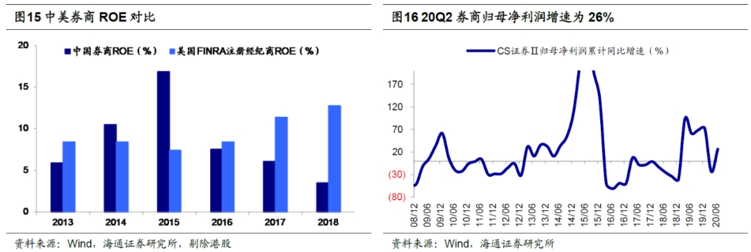 中长期主战场是转型升级,中短期兼顾经济复苏。我们一直强调,牛市中主线和轮涨并不矛盾,目前A股正处在风格阶段性再平衡阶段,类似于14年Q4,这次经济复苏带动牛市进入轮涨阶段,但轮涨幅度不会达到14年底的水平,因为经济结构和投资者结构不同,详见《现在与14年底的异同-20200920》。中长期角度看,这次是转型升级牛市,主线是科技,类似1980-2000年的美股,产业结构升级是核心。展望未来一年到一年半,即这轮牛市的终点,科技仍是产业主线,基本面将更强,如计算机、新能源产业链等。站在当前时点,往后看到年底,我们认为需兼顾经济复苏逻辑,创业板牛市3浪已走完大半程,而主板牛市3浪仍在进行中,疫情冲击过去后主板基本面正在逐步改善,行情有望从早周期向后周期板块蔓延。其中,我们首推券商,不仅有短期轮涨补涨的逻辑,也有金改带来的长期盈利能力提高的逻辑。从短期看,当前市场已进入本轮牛市3浪上涨阶段,成交量放大将推高券商业绩,20Q2券商归母净利润同比增速已高达26%,但今年以来券商行业涨幅只有12.5%。前期报告《牛市3浪的三大特征-20200712》中我们预计本轮牛市3浪期间A股成交额有望达到1.5万亿左右,行情最热时日成交额可能会接近2万亿,券商净利润有望进一步提升,估值也将抬升。中期看,金改将改变券商业态,创业板注册制改革、新三板精选层推出说明金改已在路上,当前中国产业结构升级目标类似美国,即大力发展科技产业,融资结构也将对标,然而美国券商ROE13%、中国仅6%,我们认为金改最终将提高券商ROE。20Q2基金重仓股中券商股持有市值占比为0.49%,处于05 年以来从低到高16%的历史低位。详见《策略看好券商的逻辑-20200707》、《策略看好券商2:三个逻辑-20200909》。此外,随着三季度基本面修复的趋势逐步确认,早周期行业已经上涨,四季度则重点关注银行、保险、地产等低估的后周期板块,一方面宏观经济数据回升支持金融地产估值修复,银行是典型的后周期行业,经济数据改善后资产质量担忧下降,PB将修复,目前只有0.77倍,另一方面四季度基于排名等因素,会出现资金博弈的现象,以金融地产为代表的板块低涨幅、低配置、低估值,历史上看这些行业在四季度可能被资金追逐,前期报告《银行地产岁末年初多异动-20190926》中分析过。