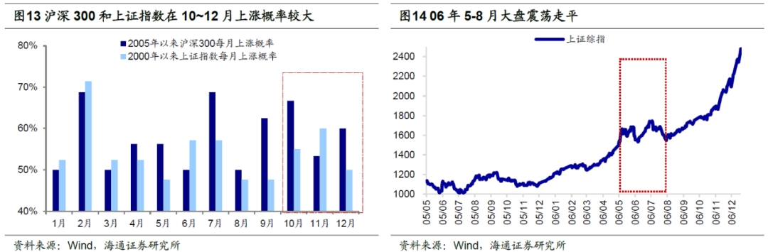 四季度股市上涨概率大,循级而上。统计历史上沪深300每个月上涨概率,我们发现四季度上涨的概率整体较高,2005年以来沪深300在10月、11月、12月上涨概率分别为67%、53%、60%,而其他月份均值为57%。上周周报《丹枫迎秋-20200927》中,我们提到回顾历史通常每年都有两波10%及以上的上涨行情机会,今年沪深300指数最大的行情在3-7月,期间指数最大涨幅接近40%。由于今年的行情肯定不属于单边下降的熊市,因此根据历史上一年2次大行情的规律,今年沪深300指数还有望出现第二次行情,Q4行情仍可期。今年7月以来市场进入了震荡盘整行情,本质上还是因为经济弱复苏下货币政策微调,市场担忧未来基本面的复苏能否持续以及货币政策会何时真正收紧。基本面上,8月工业增加值当月同比5.6%,已恢复至疫情前的水平;政策面上,随着基本面的逐渐修复,5月起货币政策开始微调,目前R007与十年期国债利率均已从5月低点恢复至疫情前的水平。当前市场的震荡行情及对应的宏观背景与06年5-8月十分相似。06年的股市是一个全年大幅上涨的牛市,但是在5-8月这三个月大盘整体横盘,背后的原因也是投资者担忧政策转向、基本面改善不可持续。这次和06年中较为类似,我们认为目前市场也处在牛市3浪中,由资金面+基本面双轮驱动。前文提到观察宏观流动性“价”的指标除了看R007和国债利率,还要看包括一般贷款加权平均利率、LPR利率、理财及信托利率等在内的其他广谱利率,这些指标目前依旧保持低位,因此宏观流动性并未明显收紧,在通胀未明显升高前,宏观流动性不会明显收紧。基本面上,库存周期和政策推动因素下,我们预计Q3/Q4单季净利润同比增速有望分别达13%、20%,全年同比有望达到0-5%。因此整体看我们认为两大驱动因素不变的情况下,牛市3浪的上涨趋势并未改变,循级而上。