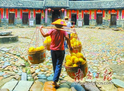 梅州大埔蜜柚上月开采上市,村民挑着刚采下的蜜柚回到围龙屋。 陈楷进 摄