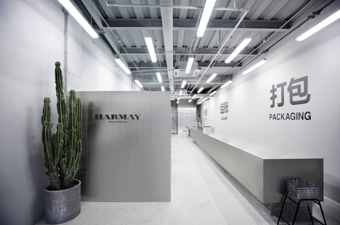 彼时的线下美妆店,玩法单一,因此HARMAY团队想用电商的基因做线下,把“货架、打包、纸箱、快递”这些因素都搬到线下。