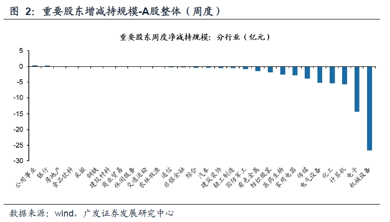 (2)重要股东增减持(A股整体):上周重要股东减持5亿元,前一周净减持约73亿元。其中增持规模前三的行业为公用事业、银行、房地产;减持规模前三行业为机械设备、电子、计算机。