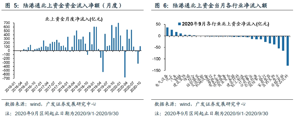 (5)陆港通北上资金流入净额:上周陆股通北上资金净流入113亿元,前一周净流出41亿元。截止2020年9月30日,2020年9月北上资金净流出318.61亿元,净流入前五名行业是电气设备、化工、汽车、钢铁、建筑装饰,净流出行业前五名是食品饮料、非银金融、电子、医药生物、家用电器。