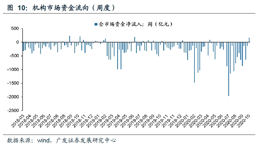 说明:二级市场的银证转账数据从17年6月16日以后不再更新,故此后A股资金流动合计数据不包含此项目;本报告数据更新至上周日(2020年10月11日)。