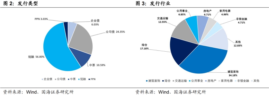 发行行业方面,本期信用债发行行业主要包括建筑装饰、综合、交通运输、公用事业、房地产、家用电器、非银金融,发行金额占比34.18%、17.18%、12.55%、6.85%、6.71%、4.99%、4.71%。