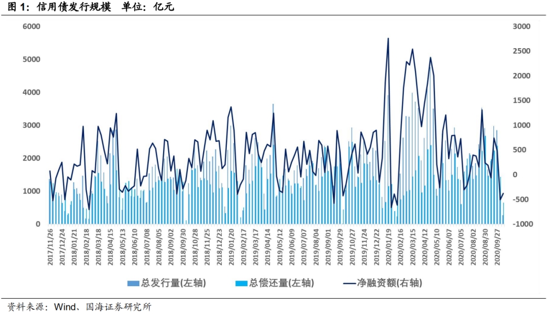 发行规模方面,本期信用债(含企业债、公司债、中票短融、PPN)发行总规模1196.21亿元,偿还总规模2083.27亿元,净融资额-887.06亿元。