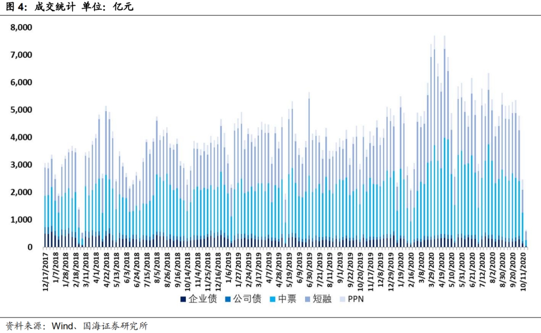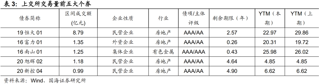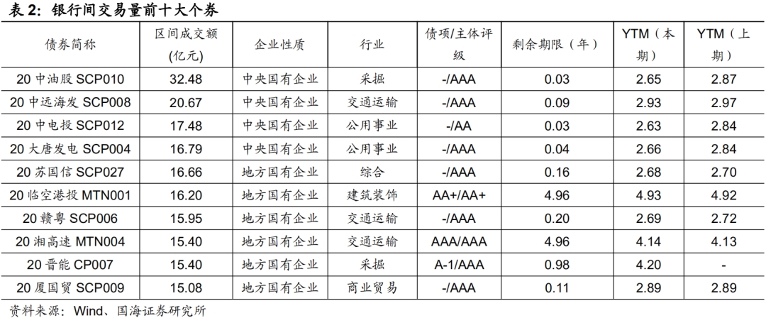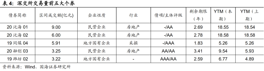 本期银行间成交最活跃的个券是20中油股SCP010、20中远海发SCP008、20中电投SCP012、20大唐发电SCP004、20苏国信SCP027、20临空港投MTN001、20赣粤SCP006、20湘高速MTN004、20晋能CP007、20厦国贸SCP009,银行间市场是交通运输和公用事业行业比较热门。上交所最活跃个券是19恒大01、16富力01、16南山01、20旭辉02、20新控04,深交所则是20泛海01、20泛海02、19同煤04、20融创03、19潍坊02,交易所市场是房地产行业受到较多关注。