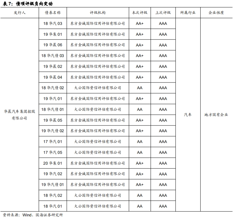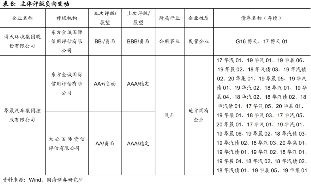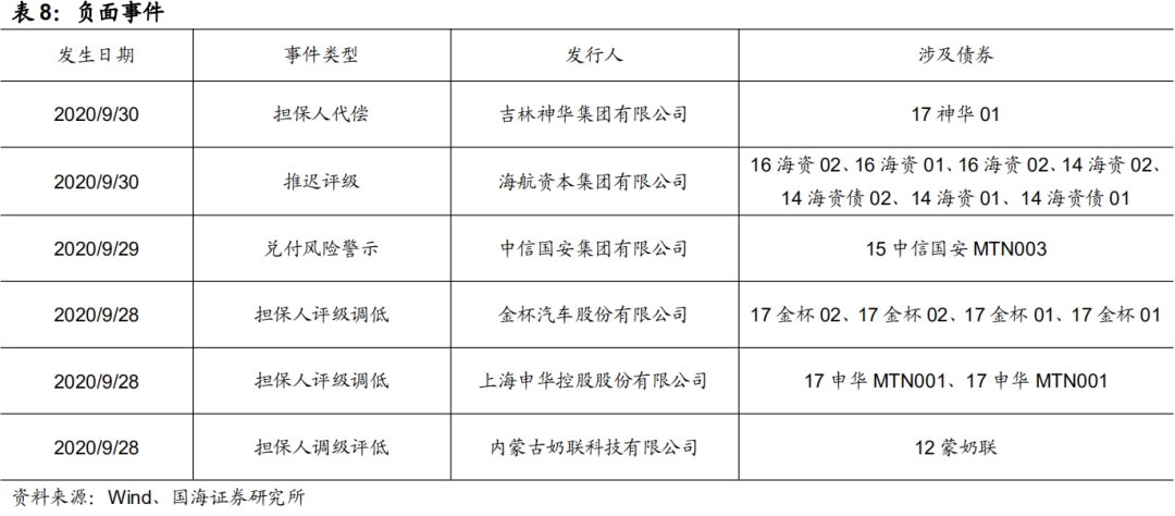 本期负面事件有(1)吉林神华集团有限公司担保人代偿、(2)海航资本集团有限公司推迟评级、(3)中信国安集团有限公司兑付风险警示、(4)金杯汽车股份有限公司担保人评级调低、(5)上海申华控股股份有限公司担保人评级调低、(6)内蒙古奶联科技有限公司担保人评级负面。