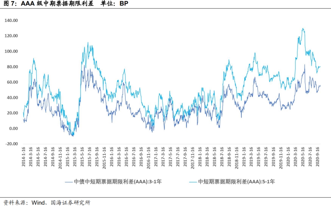 采用AAA级各期限中短期票据的差异作为利差标的。2020年10月10日,3年期与1年期、5年期与1年期利差分别为56.14BP、80.42BP,相比于上期分别变动4.46BP、1.11BP。3年期和5年期中票期限利差均有所走扩。