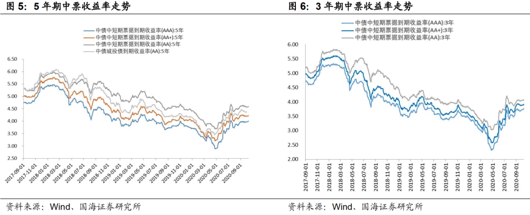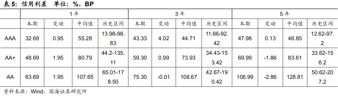 本期3年期和5年期中票收益率均有所上行。3年期AAA、AA+、AA中票收益率分别变动8.03BP、5.00 BP、4.00 BP至3.77%、3.92%和 4.08%;5年期AAA、AA+、AA中票收益率分别变动4.68BP、2.69BP、1.69 BP至4.00%、4.23%和4.60%。