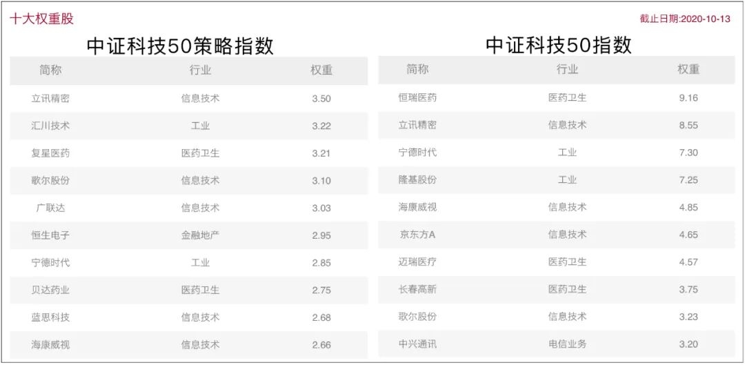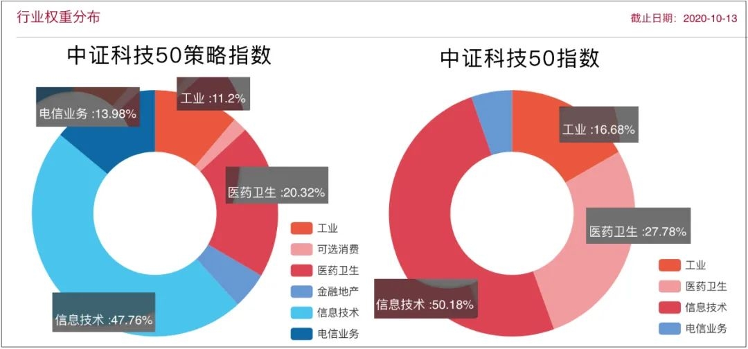 从行业分布来看。两只指数均覆盖信息技术、医药卫生、工业、电信业务,但是科技50策略指数还包括少量可选消费和金融地产。当初考虑的逻辑如下:1、都属于泛科技指数,并且以TMT行业为主,确保了科技赛道属性;2、医药板块的整体估值暂时可能比科技板块可能还要“吓人”些,但是医药板块出牛股(龙头股)是历史铁律,可以配置少量医药赛道;3、谁说可选消费和金融地产就不能出少量带有科技属性的牛股?并且这两个板块的能出的牛股必然是大市值龙头股。所以从以上三个逻辑,司令倾向于行业覆盖相对更广的泛科技指数。