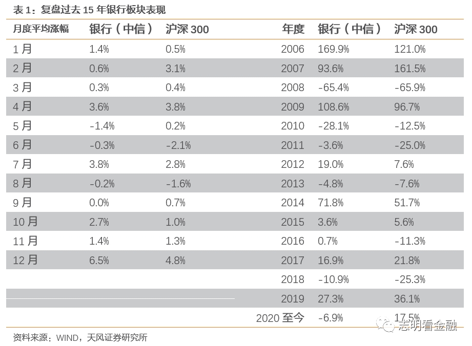 1)复盘过去15年来看,银行股下跌后的下一年板块表现往往较好。例如,18年银行板块下跌10.9%,次年上升27.3%;13年下跌4.8%,次年上涨71.8%;08年下跌65.4%,次年上涨108.6%。而20年年初至今下跌6.9%,未来一年有望表现较好。此外,过去15年复盘来看,年底银行板块上涨概率较高,12月份平均涨幅6.5%,显著高于其他月份,呈现估值切换行情之特征。