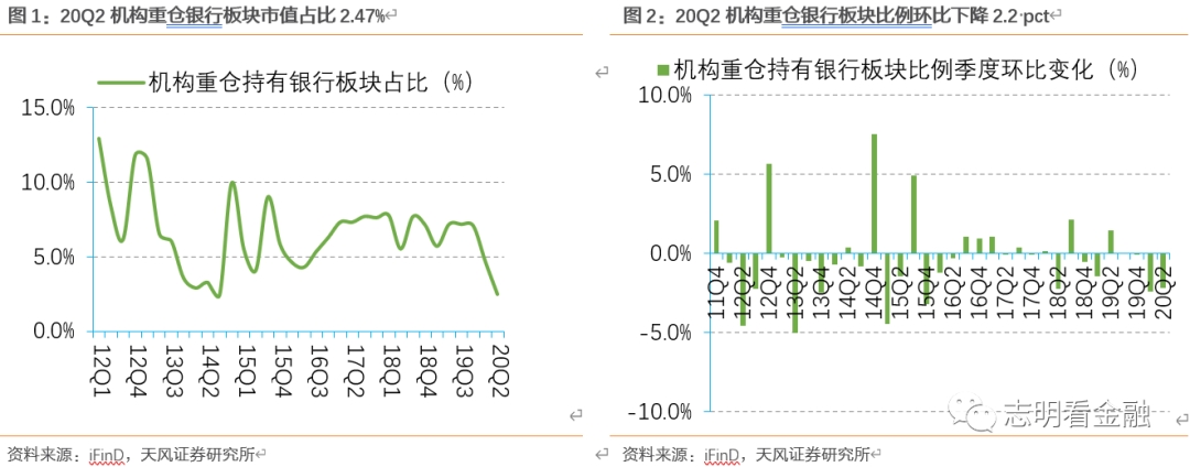 2)银行板块估值处于历史低位,机构持仓低,向下空间较小。当前,银行(申万)指数估值仅0.68倍PB(lf),处于历史低位,向下空间小;20Q2机构重仓股中银行板块持仓比例环比下降2.4个百分点至2.5%,为多年低位,机构持仓低。