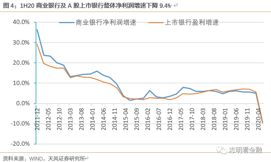 3)疫情影响可控,实质业绩增速平稳。1H20商业银行资产质量保持平稳,20Q2各类型净息差环比稳定,实质基本面保持相对稳定。1H20净利润增速显著下滑,主要是相应监管“提早谋划应对银行业不良资产大幅增长,按照实质重于形式的原则,严格资产质量分类,做实利润、提足拨备、补充资本,增强风险抵御能力。”之号召。由于提前加大拨备计提力度,未来业绩释放空间增厚。倘若还原增提拨备之影响,我们测算1H20上市银行净利润增速为+1.8%。