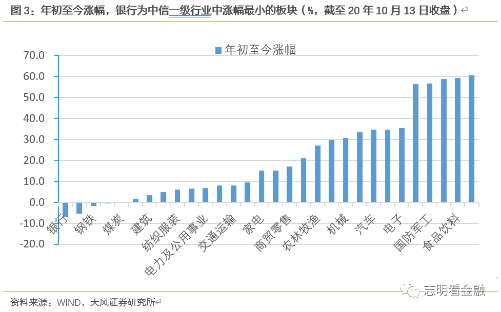 20年前三季度,受疫情及让利等影响,银行股价表现惨淡。截至10月13日收盘,年初以来银行(中信)指数下跌6.9%,为中信指数一级行业中表现最差的行业。