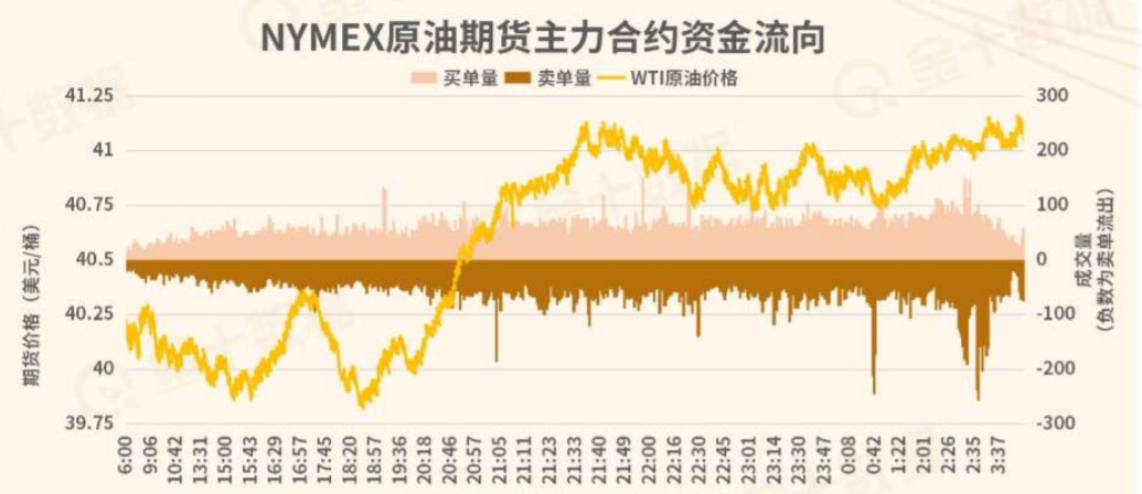 订单流方面,周三WTI原油美盘前在40.5下方徘徊,临近美盘才一举突破该水平,波动区间上移至40.75-41.2美元,在2:30结算前后订单有放量的情况,不排除是换月影响。