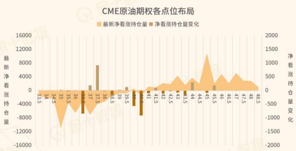 收盘价下方的看涨期权继续密集离场,暗示多头获利离场,同时40和40.5美元分别迎来400手和740手的加仓,油价下行压力增加,收盘价上方虽有看涨期权加仓,但依旧不改整体减仓的趋势,预计油价在41美元上方进一步上行的动能有限,下方支撑位关注39-39.5美元。