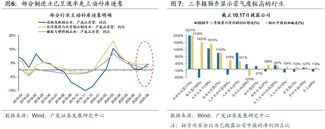 (四)第三,A股盈利扩张能否盖过估值收敛的预期?当前中观高频数据显示盈利“结构性修复”而非强回升,工业企业数据确认中游制造业率先开启主动补库存,继续跟踪10月下旬日渐明朗的A股三季报信号。8月工业企业利润数据显示,中游制造业主动补库存的信号进一步增强,制造业部分行业库存周期见底并进入主动补库阶段——收入上行、产成品库存触底或回升、原材料及中间品库存回升。我们在9.20《估值降维深化,哪些行业接力?》中提到,依据①PPI分项上行,②收入改善,③毛利稳定,④产成品库存触底或小幅抬升,⑤原材料及中间品补库存的五大条件,可以筛选出需求确定性下率先补库存的行业,在8-9月的中观景气数据中依然占优:黑色金属、工业金属、玻璃制品、电气设备、造纸、化学原料与化学制品、橡胶与塑料。