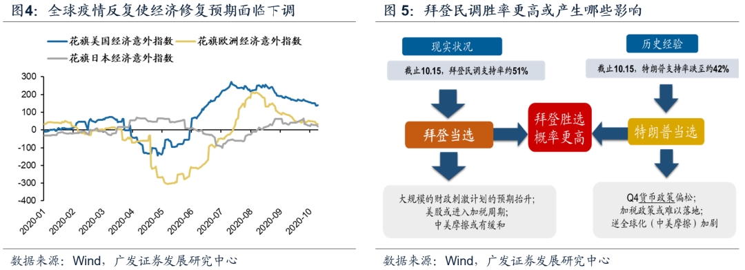 疫情反复和部分地区封锁趋严带来海外经济增长预期面临修正。后续跟踪美国大选及疫苗进展:1. 拜登民调胜率扩大,大规模财政刺激计划的预期抬升,有助于对冲“新冠”疫情反复对全球经济增长的不利影响。2. 疫苗进展也将影响经济与盈利修复斜率。