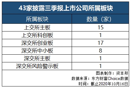 据东方财富choice数据,截至10月16日,A股市场实际披露三季报的上市公司数量为43家。其中,深交所27家,占比62.79%;上交所16家,占比37.21%。