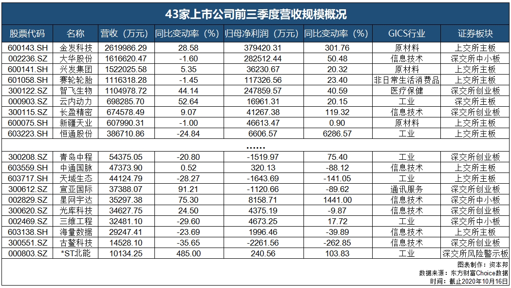 营收规模最大的3家公司,分别是金发科技(600143.SH)、大华股份(002236.SZ)、兴发集团(600141.SH),2020年前三季度分别实现262.00亿元、161.66亿元、152.20亿元。
