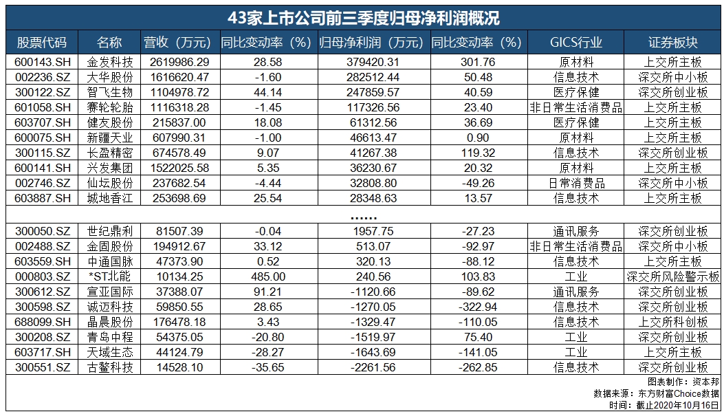 就归母净利润而言,37家企业在2020年前三季度实现了盈利,占比86.05%;6家实现亏损,占比为13.95%,且亏损幅度动辄以千万级论。