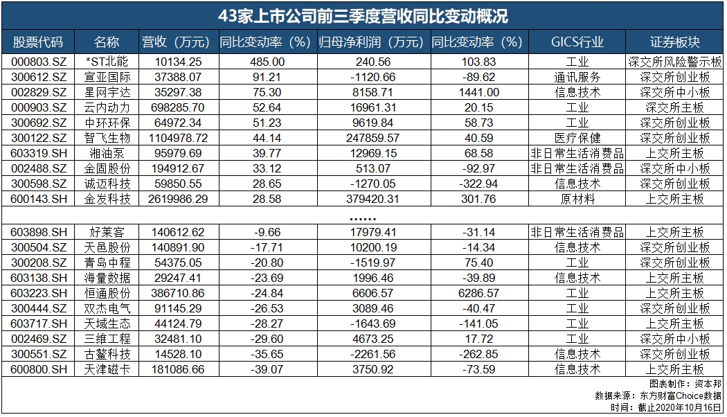 较去年同期,营收增长最显著的为*ST北能(000803.SZ)。虽然“披星戴帽”,今年前三季度营收规模在43家企业中最小,仅1.01亿元,但该公司营收较去年同期增长485%,且实现了盈利。报告期内,*ST北能实现归母净利润240.56万元,同比增加了103.83%。