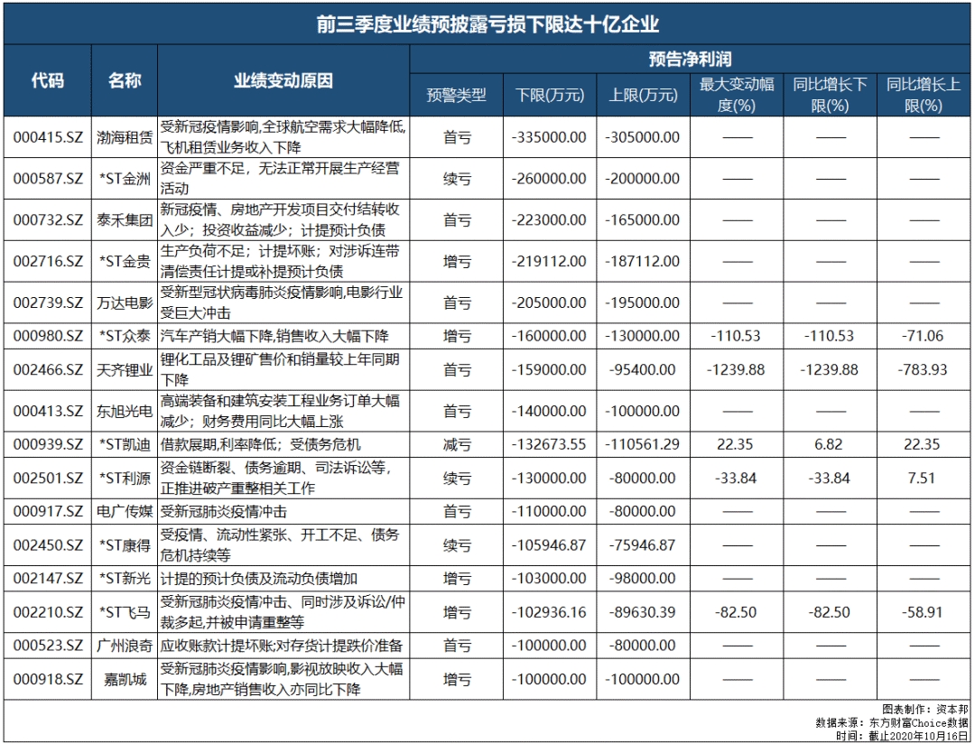 目前看来,亏损最大的为渤海租赁(000415.SZ),预计2020年前三季度将亏损30.50亿元至33.50亿元。