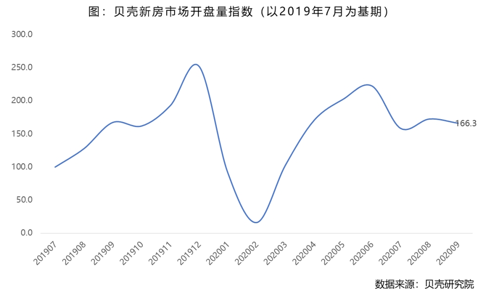 从贝壳新增开盘量指数可以看到,新房市场供应量从3月开始复苏,至6月达到近一年以来的峰值,随后出现明显下滑,在8月小幅反弹后,9月开盘量指数继续保持下滑趋势。市场在上半年完成供应量的强势补充后,下半年开始逐渐收缩,未见“金九”的供应量爆发。