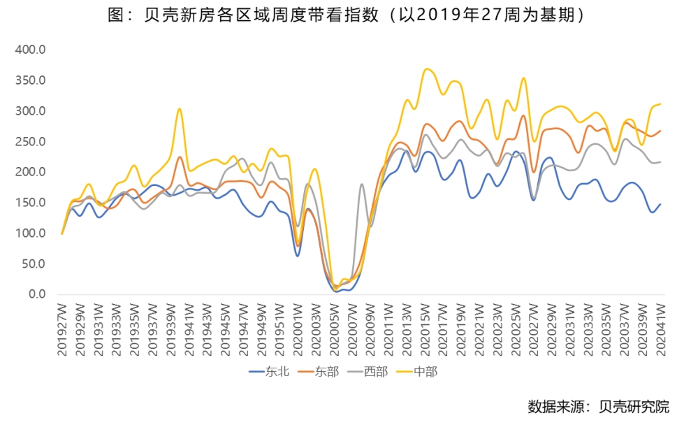 从近几周各区域带看指数看,除东北地区出现明显的震荡下降趋势外,其他三个区域基本保持稳定,其中东部和西部地区在上周有所反弹,预计10月下半月市场成交量或将有所增长,中部地区带看指数反弹力度较大,且连续3周保持增长,10月市场表现值得关注。
