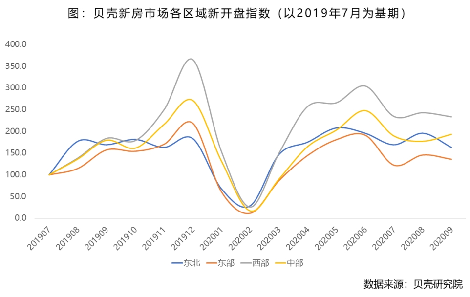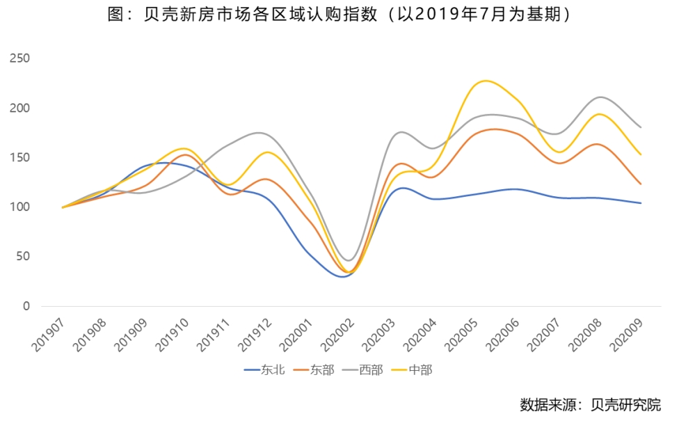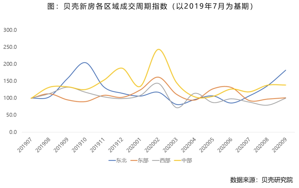 从成交周期来看,2020年9月,东部和西部地区市场表现较好,成交周期指数较低,其中西部地区成交指数同比下降33%,东部地区小幅增长4.5%。东北和中部地区保持高位。