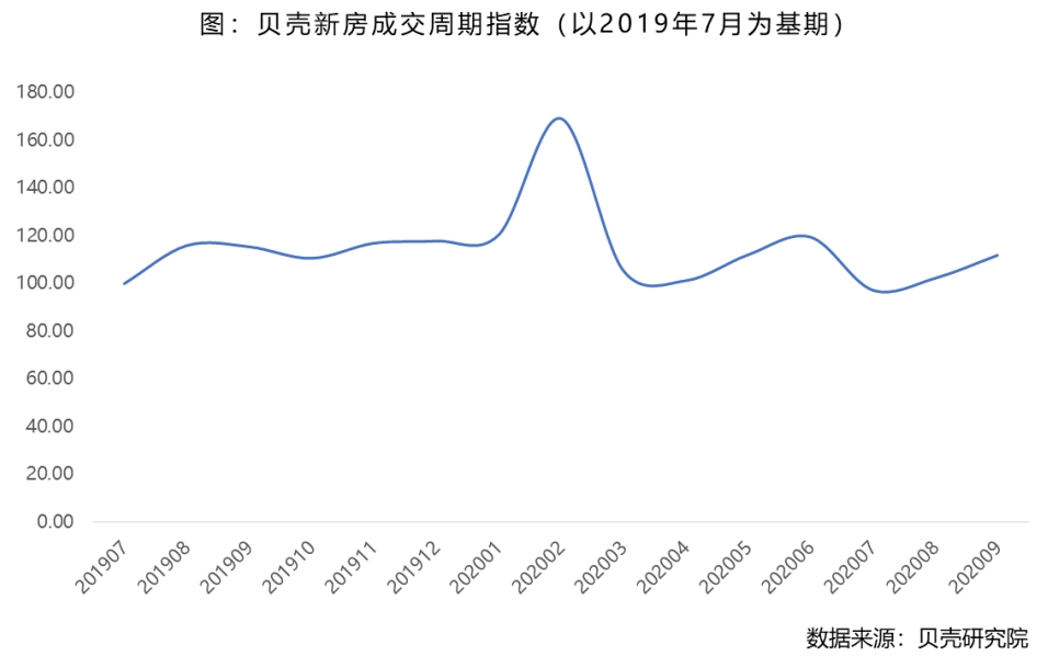 与此同时,贝壳新房价格指数从3月市场复苏以来,保持涨势,但涨幅较小,8月达到峰值后9月保持稳定,同比增长1.5%。可见供需两端对于市场后市仍保持信心,但随着黄金周、双十一等营销节点开发商释放一定折扣,价格增速将放缓。