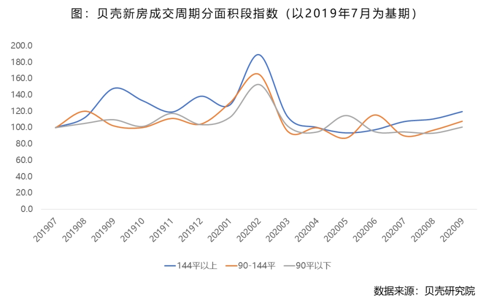 分面积段看,144平米以上产品成交周期指数较高,且6月以来持续加长,改善型客户观望情绪渐浓。中小面积产品成交周期指数稳定在相对较低的水平,且低于去年同期水平。刚需客户作为市场主力成交客群,决策周期保持低位。