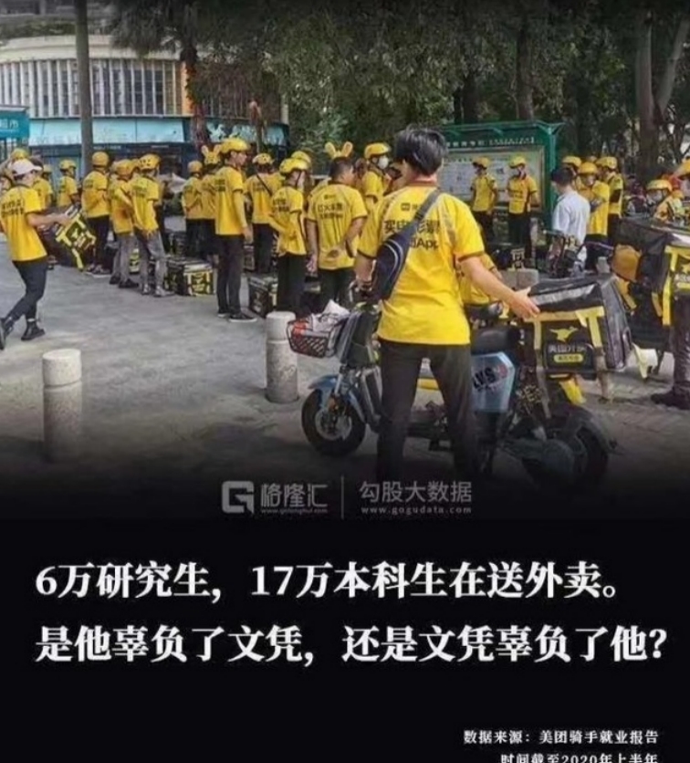 最近看到一组数据,全国有6万研究生、17万本科生在送外卖。这还只统计了送外卖的高学历,不包括在快递、骑手行业的从业人员,如果算上快递小哥,这个数字将更恐怖。甚至有人追问:是学历辜负了他们,还是他们辜负了学历。