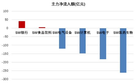 从本周的资金面上来看,绝大多数行业都出现主力净流出的情况,申万一级行业中仅有银行板块流入金额可观,达到接近41亿元的水平。