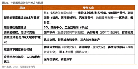对于十四五规划可能涉及的重点方向,天风证券策略团队分析认为,结合当前特殊的时代背景以及近阶段国家政策的关键词来看,要素市场化建设是增长和平衡困局的药方。那么基于要素配置改革和双循环的背景,以下这些方面可能会受益于十四五规划,供小伙伴们参考。