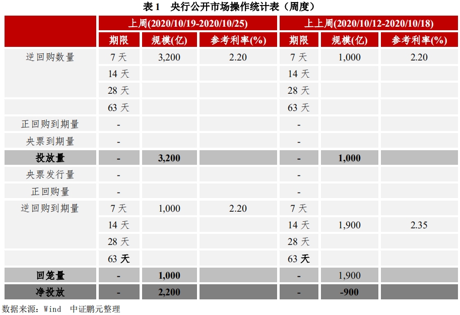 上周(2020/10/19-2020/10/25),央行在公开市场进行逆回购操作3,200亿元,上周有1,000亿元逆回购到期,因此上周央行公开市场净投放2,200亿元。