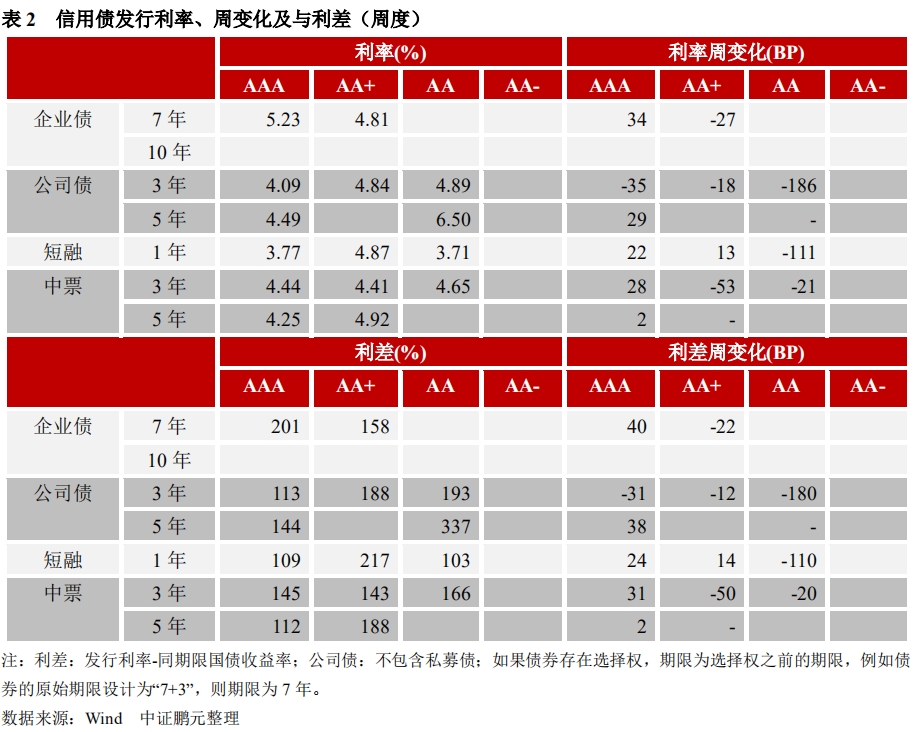 发行利率和利差方面,企业债、公司债和中票短融涨跌互现
