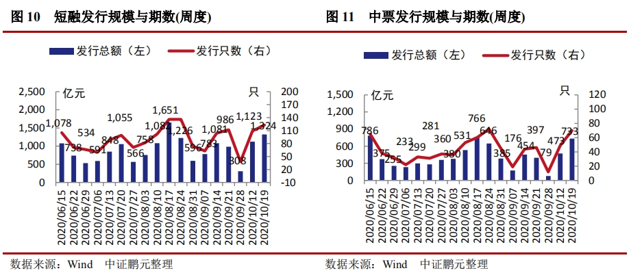 上周短期融资券发行1,323.88亿元,发行只数为123只,其中超短融108只,发行金额1,178.2亿元。上周短融主体级别分布为AAA级69只、AA+级45只,AA级8只。上周中期票据发行732.8亿元,发行只数为70只,均为一般中期票据。上周中票债项级别分布为AAA级40只、AA+级20只,AA级10只。
