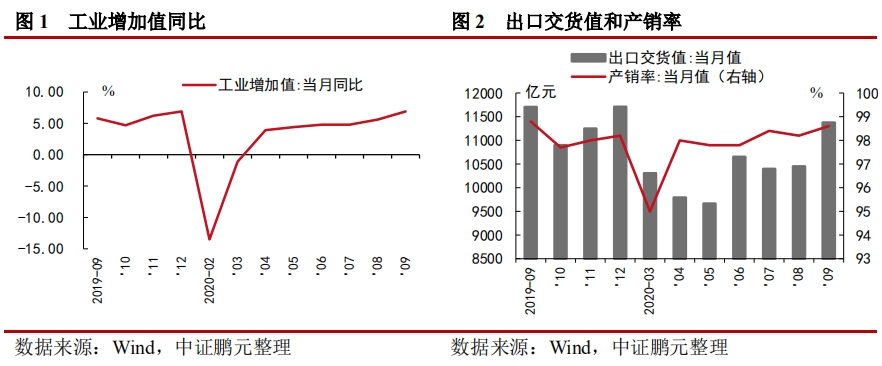 9月份,工业企业产品销售率为98.6%,较上年同月下降0.4个百分点;工业企业实现出口交货值11,376亿元,同比名义下降1.8%,但从环比情况来看均有明显回升。