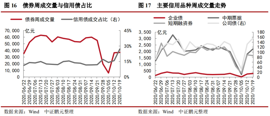 成交量较前一周上升,信用债券占比上升;利率债到期收益率全线下行,信用债到期收益率涨跌互现