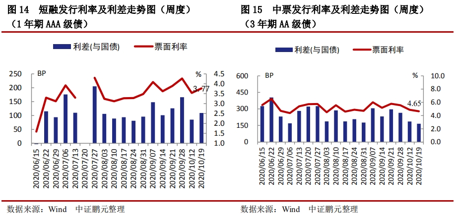 上周1年期AAA级别短融的平均发行利率为3.77%,与同期限国债的平均利差为109BP。上周3年期AA级别中票的平均发行利率为4.65%,与同期限国债的平均利差为166BP。