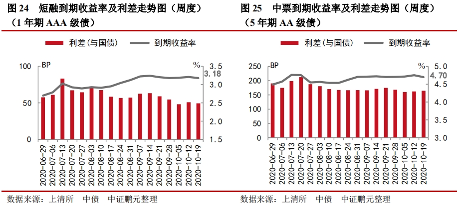 1年期AAA级别短期融资券上周平均到期收益率为3.18%,较前一周下行3.04BP;与同期限国债平均利差为49.43BP,较前一周收窄1.48BP。5年期AA级别中期票据上周平均到期收益率为4.70%,较前一周下行5.33BP;与同期限国债平均利差为164.26BP,较前一周扩大2.40BP。