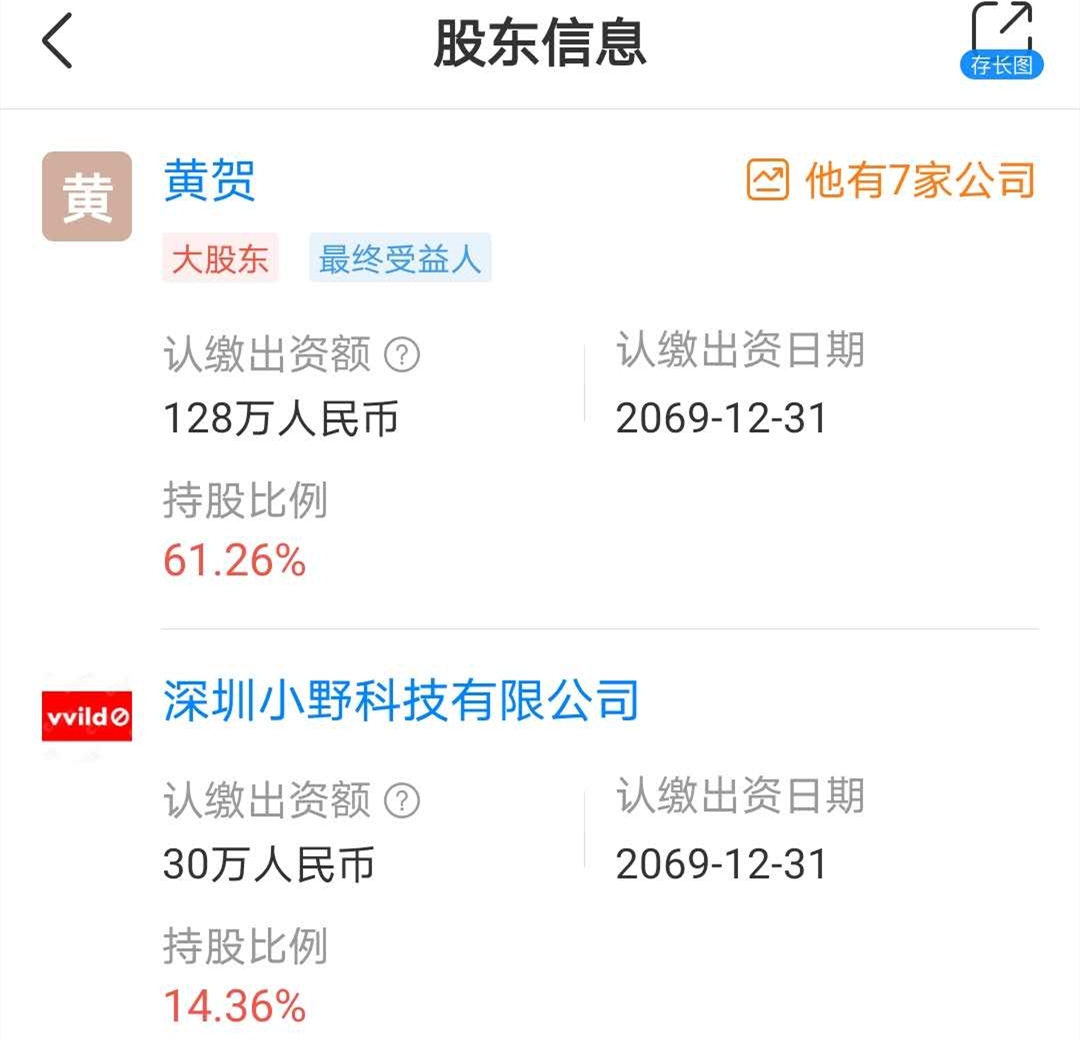 天眼查显示,成立于2020年4月15日的星空野望,其控股股东为黄贺,持股61.2571%;深圳小野科技有限公司(下称“小野科技”)持股14.36%,位列第二大股东。而这两者都与罗永浩有着紧密关联。