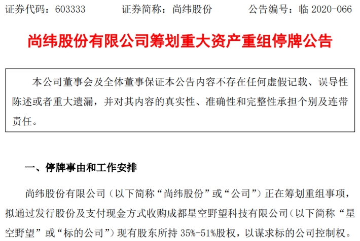 10月26日晚间,尚纬股份发布公告称,公司正在筹划重组事项,拟通过发行股份及支付现金方式收购成都星空野望科技有限公司(下称“星空野望”)现有股东所持的35%-51%股权,以谋求星空野望控制权。