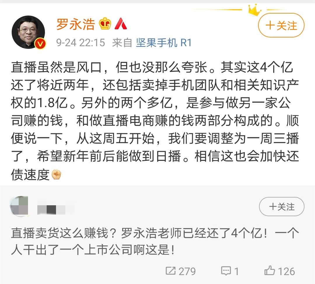 对此,罗永浩也在微博回应表示,其实4亿债务还了将近两年,包括卖掉手机团队和相关知识产权所得的1.8亿,另外的2亿多来自参与另一家公司营利和直播电商获得的收入。