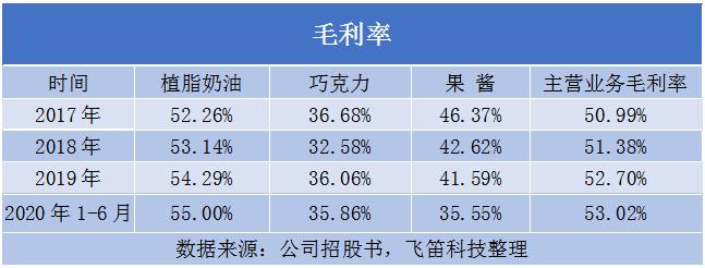 报告期内,公司的主要产品植脂奶油的毛利率分别为52.26%、53.14%、54.29%和55%,逐年上涨。主要原因是,公司植脂奶油中毛利率较高的含乳脂植脂奶油的销售占比提升,其对毛利率的贡献逐年增长,使得公司植脂奶油总体毛利率增长。
